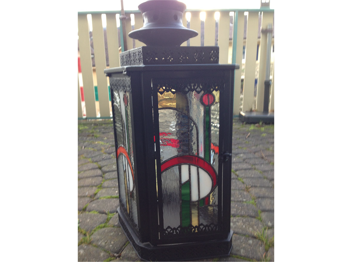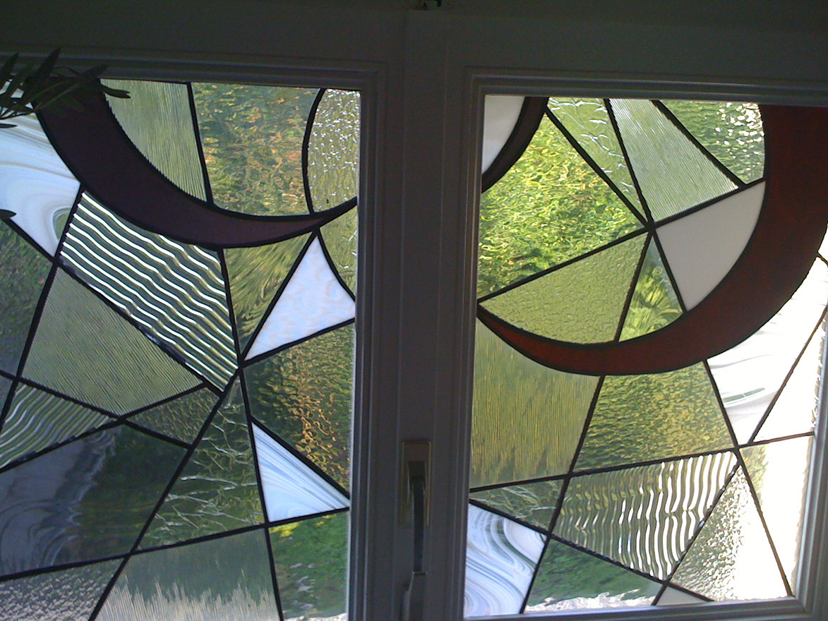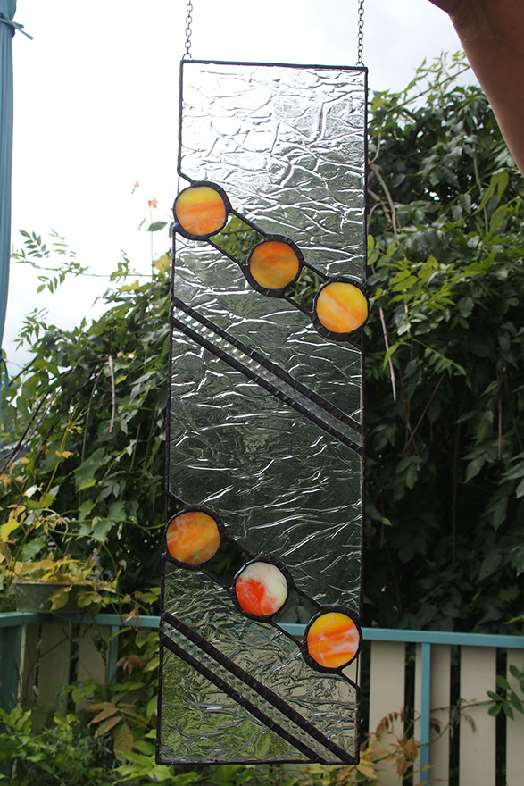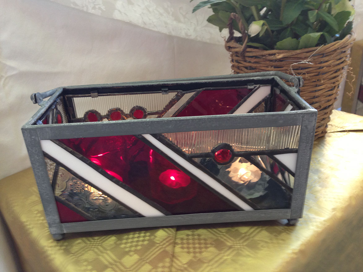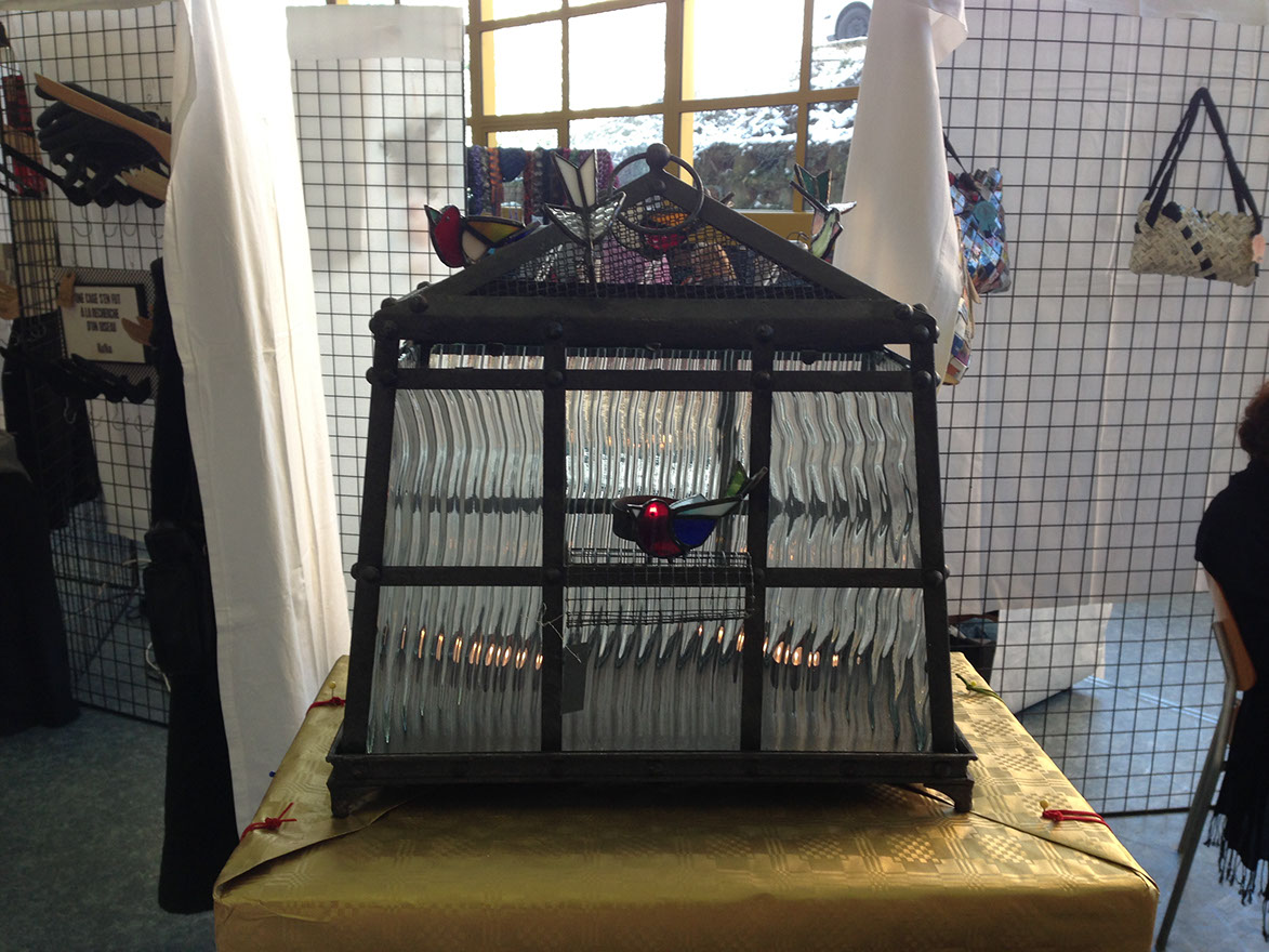 à enrubanner le contour de chaque pièce de verre à l'aide d'une mince bande de cuivre, permettant ainsi de souder directement les morceaux de verre entre eux.